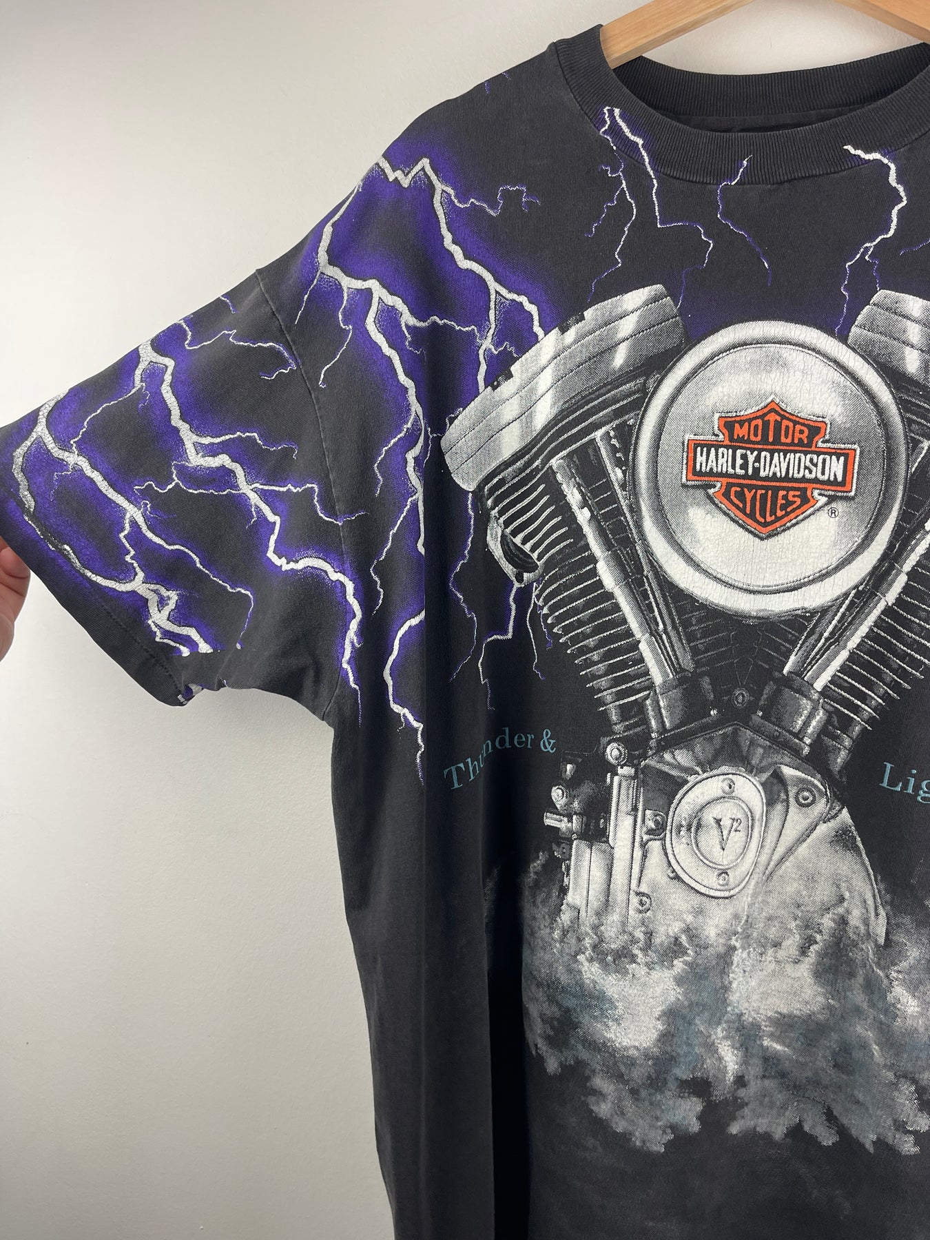 Vintage 90s Harley Davidson Illinois Thunder Lightning All Over Print Black Tee