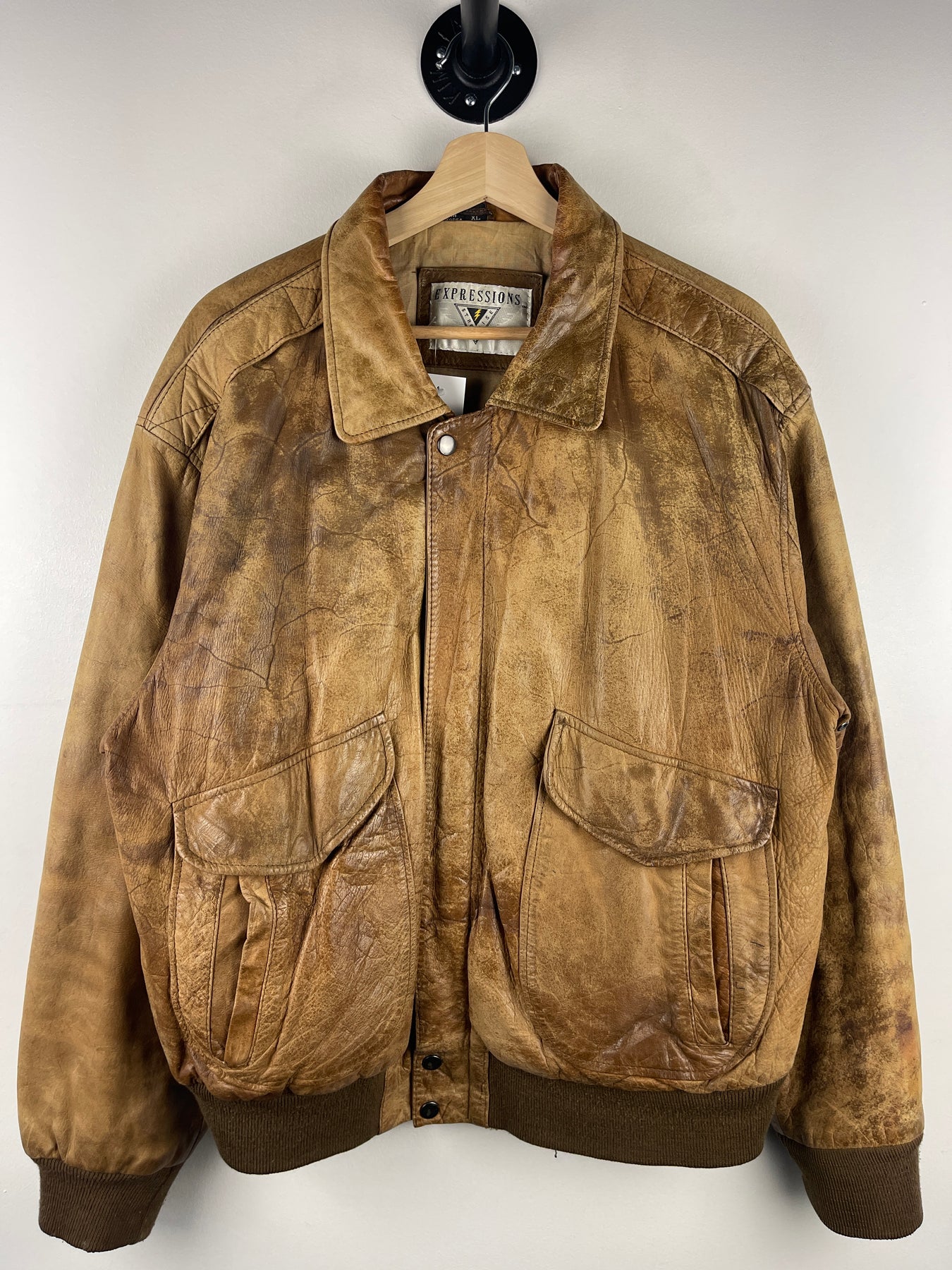 Vintage 90s Expressions Faded Brown Leather Bomber Jacket