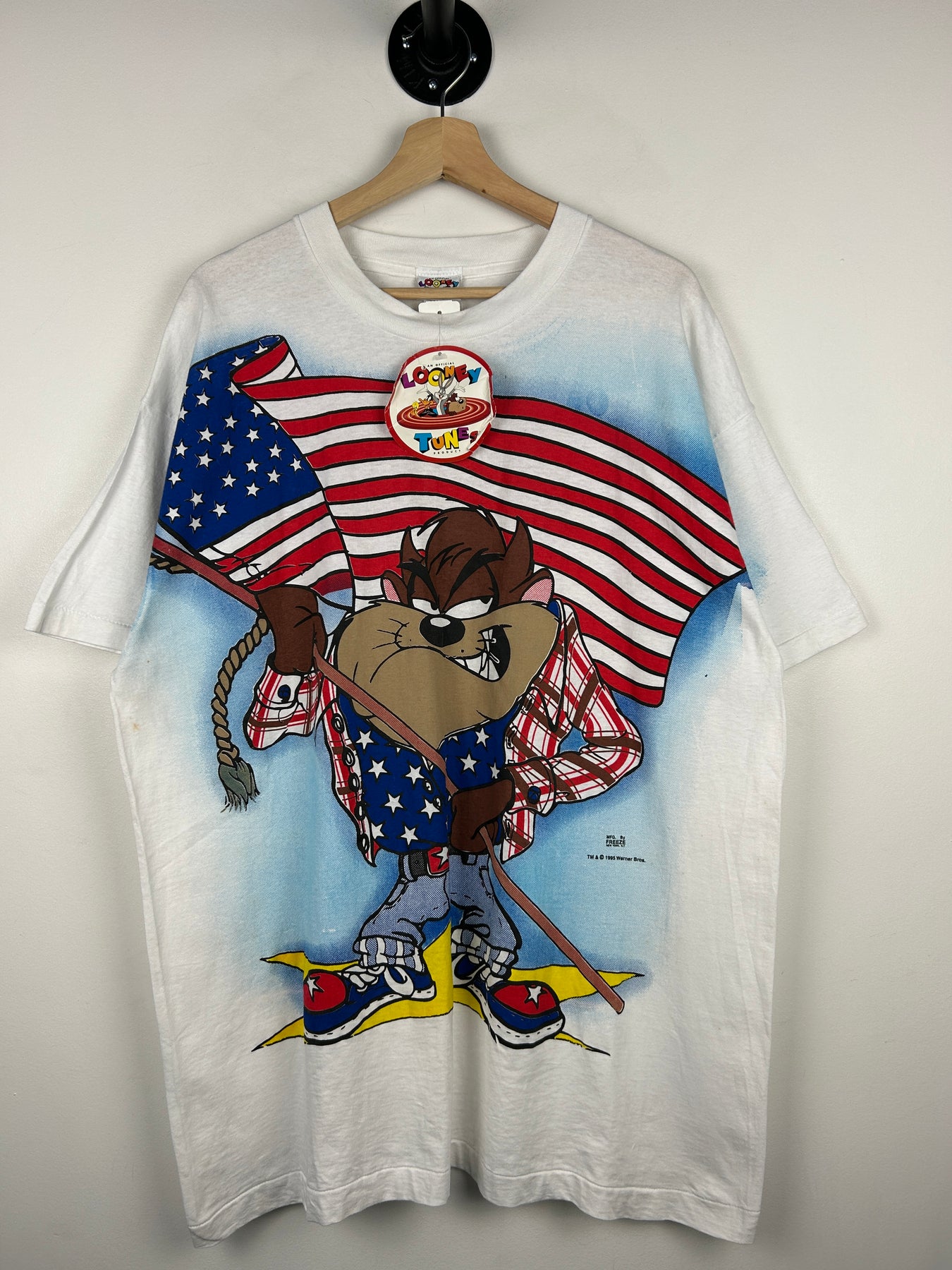 Vintage 90s Looney Tunes Taz USA American Flag Cowboy All Over Print White Tee
